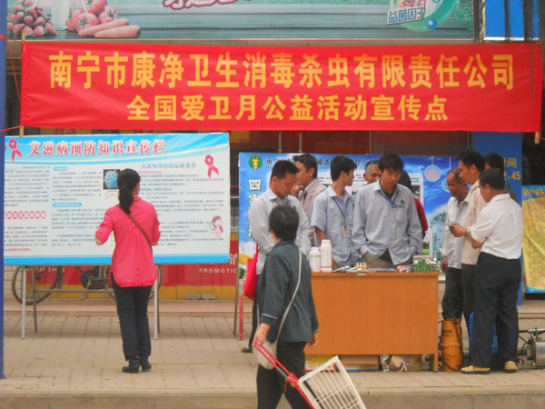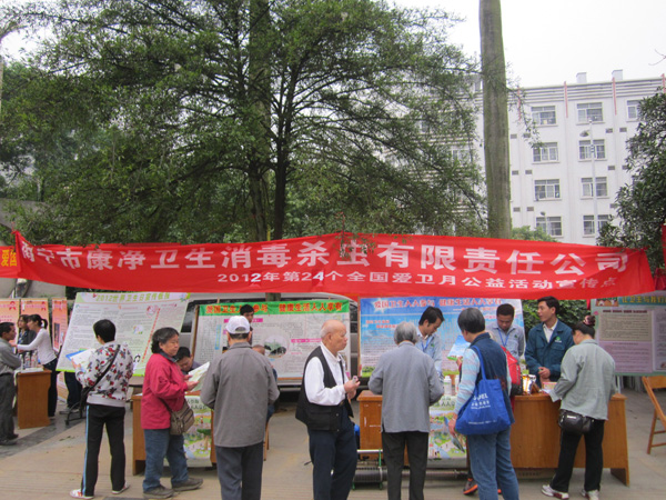 2012年4月6日在南寧市興寧區(qū)政府以及愛衛(wèi)辦的組織下,康凈公司兩個(gè)組分別在南寧市人民公園和科園西十路,開展2012年第24個(gè)全國(guó)愛衛(wèi)月公益活動(dòng),圖為愛衛(wèi)辦領(lǐng)導(dǎo)小組到科園西十路活動(dòng)現(xiàn)場(chǎng)指導(dǎo),以及康凈公司專業(yè)技術(shù)人員在人民公園為廣大市民講解四害相關(guān)知識(shí)。